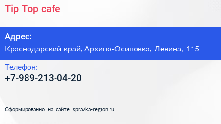 Tip Top cafe по адресу Краснодарский край, Архипо-Осиповка, Ленина, 115 в дальнейшем Организация, размещена в следующих категориях: