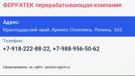 ФЕРРАТЕК, перерабатывающая компания по адресу Краснодарский край, Архипо-Осиповка, Ленина, 163 в дальнейшем Организация, размещена в следующих категориях: