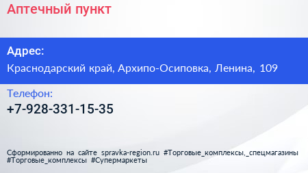 Аптечный пункт по адресу Краснодарский край, Архипо-Осиповка, Ленина, 109 в дальнейшем Организация, размещена в следующих категориях: