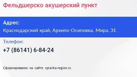 Фельдшерско-акушерский пункт по адресу Краснодарский край, Архипо-Осиповка, Мира, 31 в дальнейшем Организация, размещена в следующих категориях: