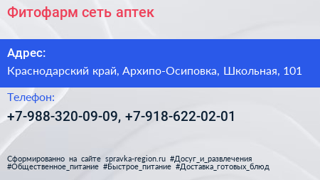 Фитофарм, сеть аптек по адресу Краснодарский край, Архипо-Осиповка, Школьная, 101 в дальнейшем Организация, размещена в следующих категориях:
