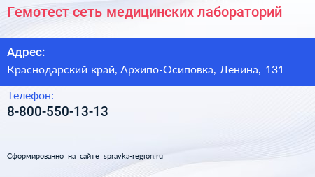 Гемотест, сеть медицинских лабораторий по адресу Краснодарский край, Архипо-Осиповка, Ленина, 131 в дальнейшем Организация, размещена в следующих категориях: