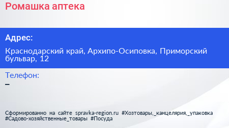 Ромашка, аптека по адресу Краснодарский край, Архипо-Осиповка, Приморский бульвар, 12 в дальнейшем Организация, размещена в следующих категориях: