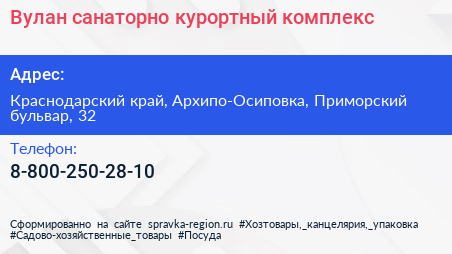 Вулан, санаторно-курортный комплекс по адресу Краснодарский край, Архипо-Осиповка, Приморский бульвар, 32 в дальнейшем Организация, размещена в следующих категориях: