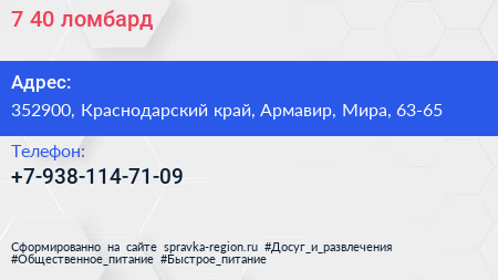 7:40, ломбард по адресу 352900, Краснодарский край, Армавир, Мира, 63-65 в дальнейшем Организация, размещена в следующих категориях: