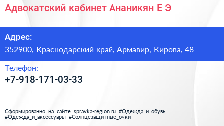 Адвокатский кабинет Ананикян Е.Э. по адресу 352900, Краснодарский край, Армавир, Кирова, 48 в дальнейшем Организация, размещена в следующих категориях: