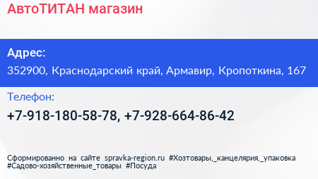 АвтоТИТАН, магазин по адресу 352900, Краснодарский край, Армавир, Кропоткина, 167 в дальнейшем Организация, размещена в следующих категориях: