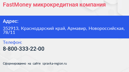 FastMoney, микрокредитная компания по адресу 352913, Краснодарский край, Армавир, Новороссийская, 78/11 в дальнейшем Организация, размещена в следующих категориях: