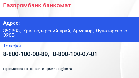 Газпромбанк, банкомат по адресу 352903, Краснодарский край, Армавир, Луначарского, 398Б в дальнейшем Организация, размещена в следующих категориях: