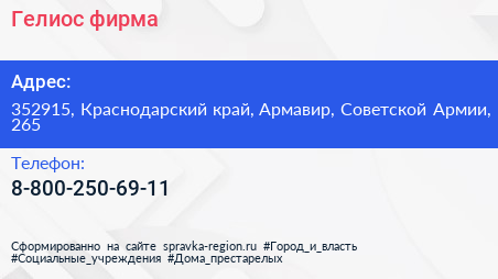 Гелиос, фирма по адресу 352915, Краснодарский край, Армавир, Советской Армии, 265 в дальнейшем Организация, размещена в следующих категориях: