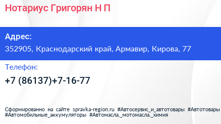 Нотариус Григорян Н.П. по адресу 352905, Краснодарский край, Армавир, Кирова, 77 в дальнейшем Организация, размещена в следующих категориях: