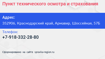 Пункт технического осмотра и страхования по адресу 352906, Краснодарский край, Армавир, Шоссейная, 57Б в дальнейшем Организация, размещена в следующих категориях: