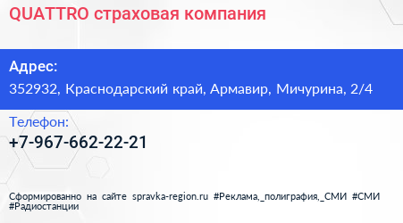 QUATTRO, страховая компания по адресу 352932, Краснодарский край, Армавир, Мичурина, 2/4 в дальнейшем Организация, размещена в следующих категориях: