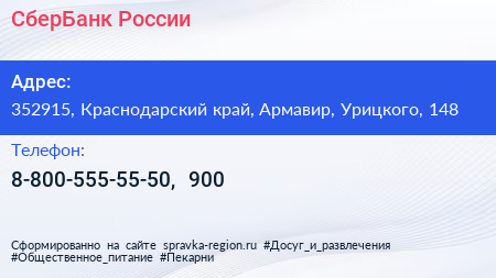 СберБанк России по адресу 352915, Краснодарский край, Армавир, Урицкого, 148 в дальнейшем Организация, размещена в следующих категориях:
