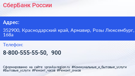 СберБанк России по адресу 352900, Краснодарский край, Армавир, Розы Люксембург, 168а в дальнейшем Организация, размещена в следующих категориях: