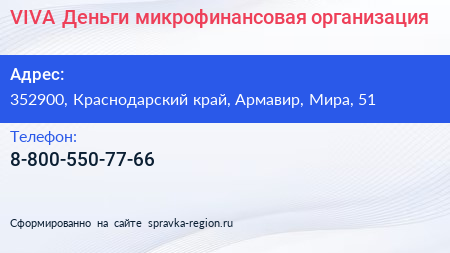 VIVA Деньги, микрофинансовая организация по адресу 352900, Краснодарский край, Армавир, Мира, 51 в дальнейшем Организация, размещена в следующих категориях: