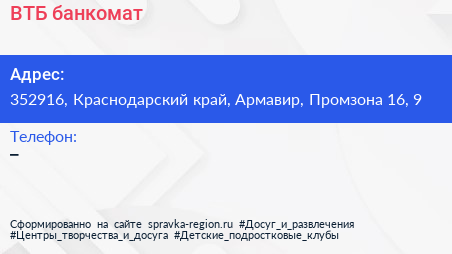ВТБ, банкомат по адресу 352916, Краснодарский край, Армавир, Промзона 16, 9 в дальнейшем Организация, размещена в следующих категориях: