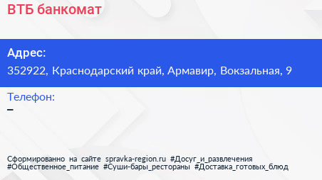 ВТБ, банкомат по адресу 352922, Краснодарский край, Армавир, Вокзальная, 9 в дальнейшем Организация, размещена в следующих категориях:
