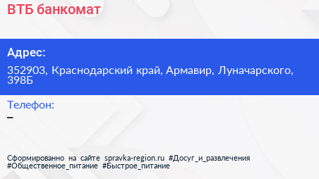ВТБ, банкомат по адресу 352903, Краснодарский край, Армавир, Луначарского, 398Б в дальнейшем Организация, размещена в следующих категориях: