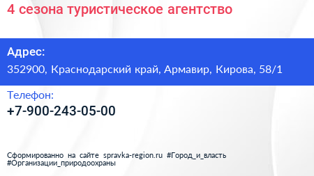4 сезона, туристическое агентство по адресу 352900, Краснодарский край, Армавир, Кирова, 58/1 в дальнейшем Организация, размещена в следующих категориях: