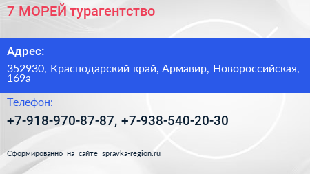 7 МОРЕЙ, турагентство по адресу 352930, Краснодарский край, Армавир, Новороссийская, 169а в дальнейшем Организация, размещена в следующих категориях:
