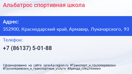 Альбатрос, спортивная школа по адресу 352900, Краснодарский край, Армавир, Луначарского, 93 в дальнейшем Организация, размещена в следующих категориях: