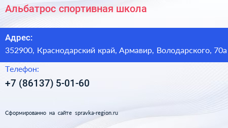Альбатрос, спортивная школа по адресу 352900, Краснодарский край, Армавир, Володарского, 70а в дальнейшем Организация, размещена в следующих категориях: