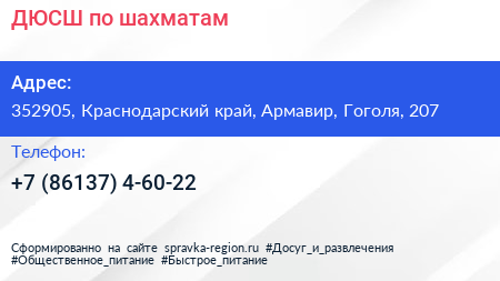 ДЮСШ по шахматам по адресу 352905, Краснодарский край, Армавир, Гоголя, 207 в дальнейшем Организация, размещена в следующих категориях: