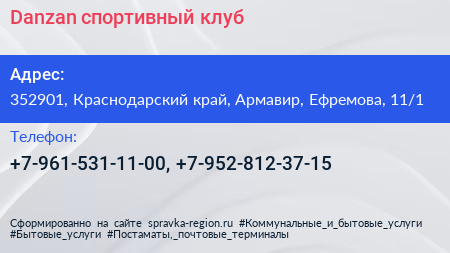 Danzan, спортивный клуб по адресу 352901, Краснодарский край, Армавир, Ефремова, 11/1 в дальнейшем Организация, размещена в следующих категориях: