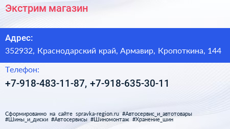 Экстрим, магазин по адресу 352932, Краснодарский край, Армавир, Кропоткина, 144 в дальнейшем Организация, размещена в следующих категориях:
