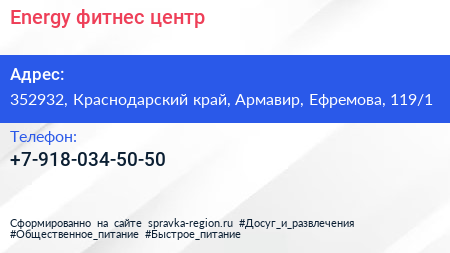 Energy, фитнес-центр по адресу 352932, Краснодарский край, Армавир, Ефремова, 119/1 в дальнейшем Организация, размещена в следующих категориях: