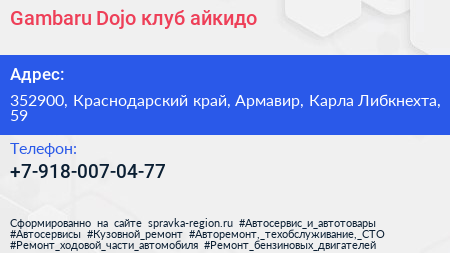 Gambaru Dojo, клуб айкидо по адресу 352900, Краснодарский край, Армавир, Карла Либкнехта, 59 в дальнейшем Организация, размещена в следующих категориях: