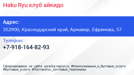 Haku Ryu, клуб айкидо по адресу 352900, Краснодарский край, Армавир, Ефремова, 57 в дальнейшем Организация, размещена в следующих категориях: