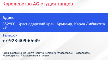 Королевство AG, студия танцев по адресу 352900, Краснодарский край, Армавир, Карла Либкнехта, 59 в дальнейшем Организация, размещена в следующих категориях: