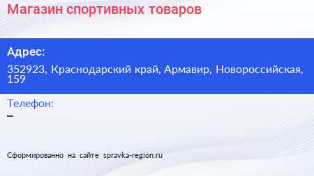 Магазин спортивных товаров по адресу 352923, Краснодарский край, Армавир, Новороссийская, 159 в дальнейшем Организация, размещена в следующих категориях: