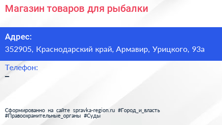 Магазин товаров для рыбалки по адресу 352905, Краснодарский край, Армавир, Урицкого, 93а в дальнейшем Организация, размещена в следующих категориях:
