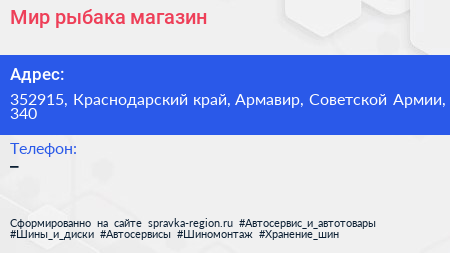 Мир рыбака, магазин по адресу 352915, Краснодарский край, Армавир, Советской Армии, 340 в дальнейшем Организация, размещена в следующих категориях: