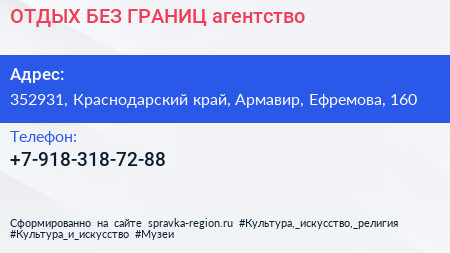 ОТДЫХ БЕЗ ГРАНИЦ, агентство по адресу 352931, Краснодарский край, Армавир, Ефремова, 160 в дальнейшем Организация, размещена в следующих категориях: