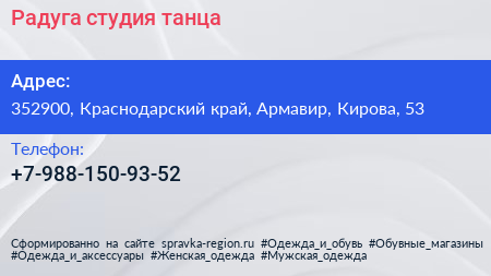 Радуга, студия танца по адресу 352900, Краснодарский край, Армавир, Кирова, 53 в дальнейшем Организация, размещена в следующих категориях: