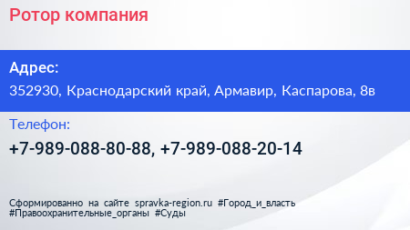 Ротор, компания по адресу 352930, Краснодарский край, Армавир, Каспарова, 8в в дальнейшем Организация, размещена в следующих категориях:
