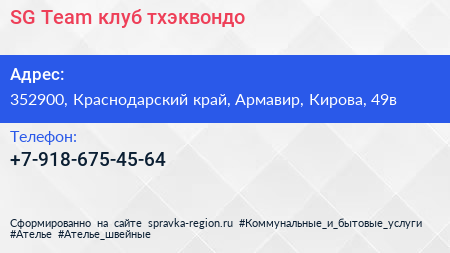 SG Team, клуб тхэквондо по адресу 352900, Краснодарский край, Армавир, Кирова, 49в в дальнейшем Организация, размещена в следующих категориях: