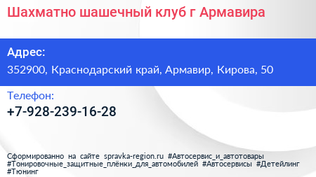 Шахматно-шашечный клуб г. Армавира по адресу 352900, Краснодарский край, Армавир, Кирова, 50 в дальнейшем Организация, размещена в следующих категориях:
