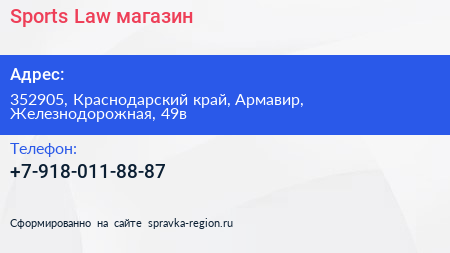 Sports Law, магазин по адресу 352905, Краснодарский край, Армавир, Железнодорожная, 49в в дальнейшем Организация, размещена в следующих категориях: