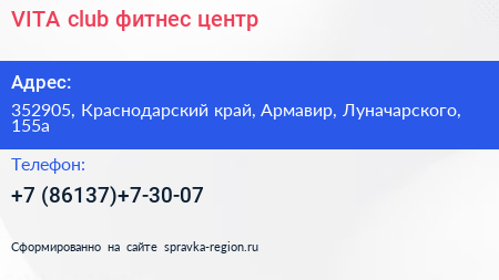 VITA club, фитнес-центр по адресу 352905, Краснодарский край, Армавир, Луначарского, 155а в дальнейшем Организация, размещена в следующих категориях: