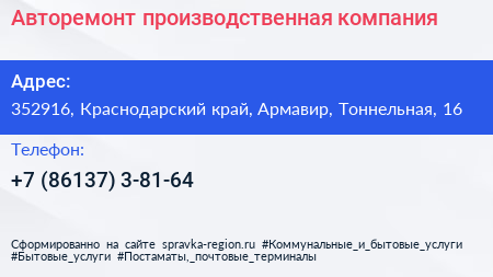 Авторемонт, производственная компания по адресу 352916, Краснодарский край, Армавир, Тоннельная, 16 в дальнейшем Организация, размещена в следующих категориях: