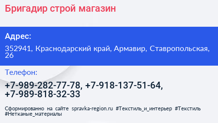 Бригадир строй, магазин по адресу 352941, Краснодарский край, Армавир, Ставропольская, 26 в дальнейшем Организация, размещена в следующих категориях: