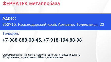 ФЕРРАТЕК, металлобаза по адресу 352916, Краснодарский край, Армавир, Тоннельная, 23 в дальнейшем Организация, размещена в следующих категориях: