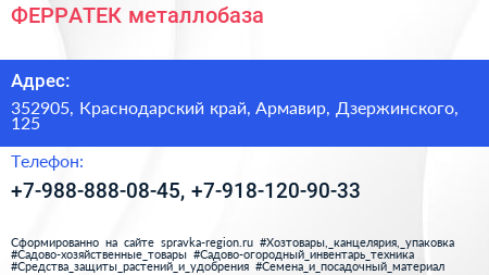 ФЕРРАТЕК, металлобаза по адресу 352905, Краснодарский край, Армавир, Дзержинского, 125 в дальнейшем Организация, размещена в следующих категориях: