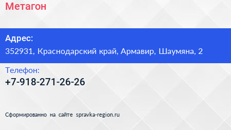 Метагон по адресу 352931, Краснодарский край, Армавир, Шаумяна, 2 в дальнейшем Организация, размещена в следующих категориях: