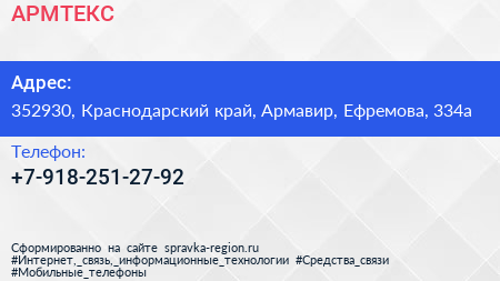 АРМТЕКС по адресу 352930, Краснодарский край, Армавир, Ефремова, 334а в дальнейшем Организация, размещена в следующих категориях: